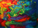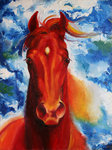 2004A spontaneous expressionistic painting of a flying horse in a colorful sky.