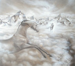2009Experiment with a monotone underpainting (the colour still has to be added) and stylized lines. This fairytale like (or fantastic realism or megical realism) painting shows a upcomming meeting between 2 horses, high in the sky. The long neck and shape of the horse's forelock give the horse on the foreground an almost mythological aura like a unicorn.